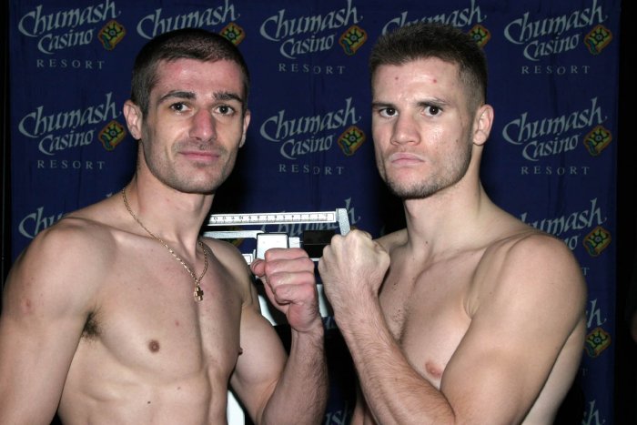 “Mighty” Mike Arnaoutis (left) and Jesse Feliciano both weighed 139 1/2 pounds Thursday for their NABO junior welterweight title fight Friday on “ShoBox: The New Generation” on SHOWTIME at 11 p.m. ET/PT (delayed on the West Coast).