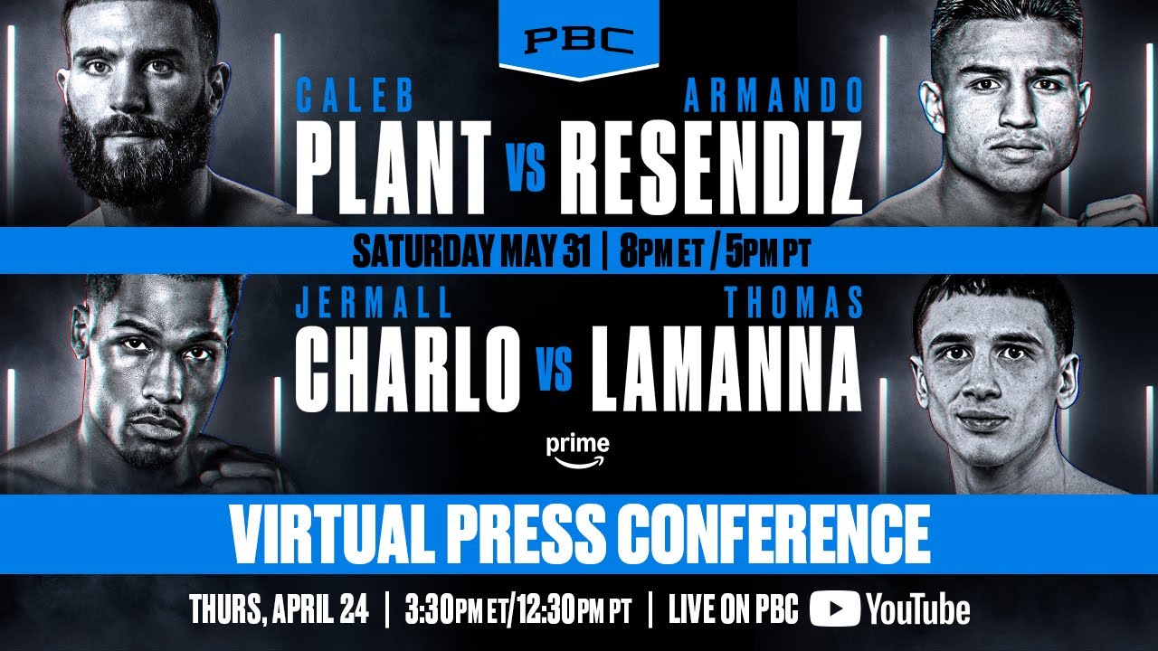 Former super middleweight world champion Caleb Plant and Mexican knockout Armando Reséndiz, plus two-division champion Jermall Charlo and veteran contender Thomas “Cornflake†Lamanna will preview their respective showdowns during a virtual press conference before they co-headline PBC Championship Boxing on Prime Video on Saturday, May 31 from Michelob ULTRA Arena at Mandalay Bay Resort and Casino in Las Vegas.
