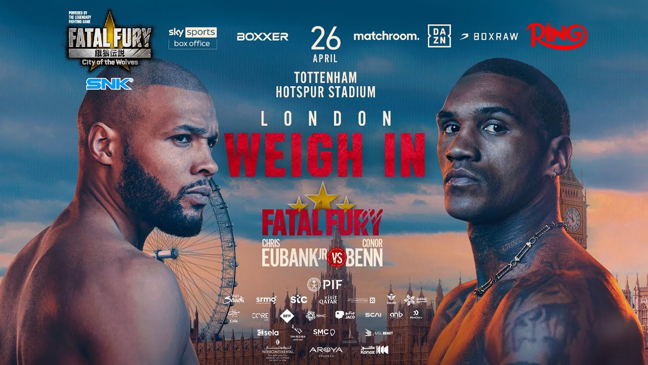Chris Eubank Jr and Conor Benn weigh-in ahead of their monster fight in London! Tune in as both fighters go head-to-head for the final time alongside the undercard Clarke vs Riley, Smith vs McKenna, Yarde vs Arthur 3, Billam-Smith vs Glanton.