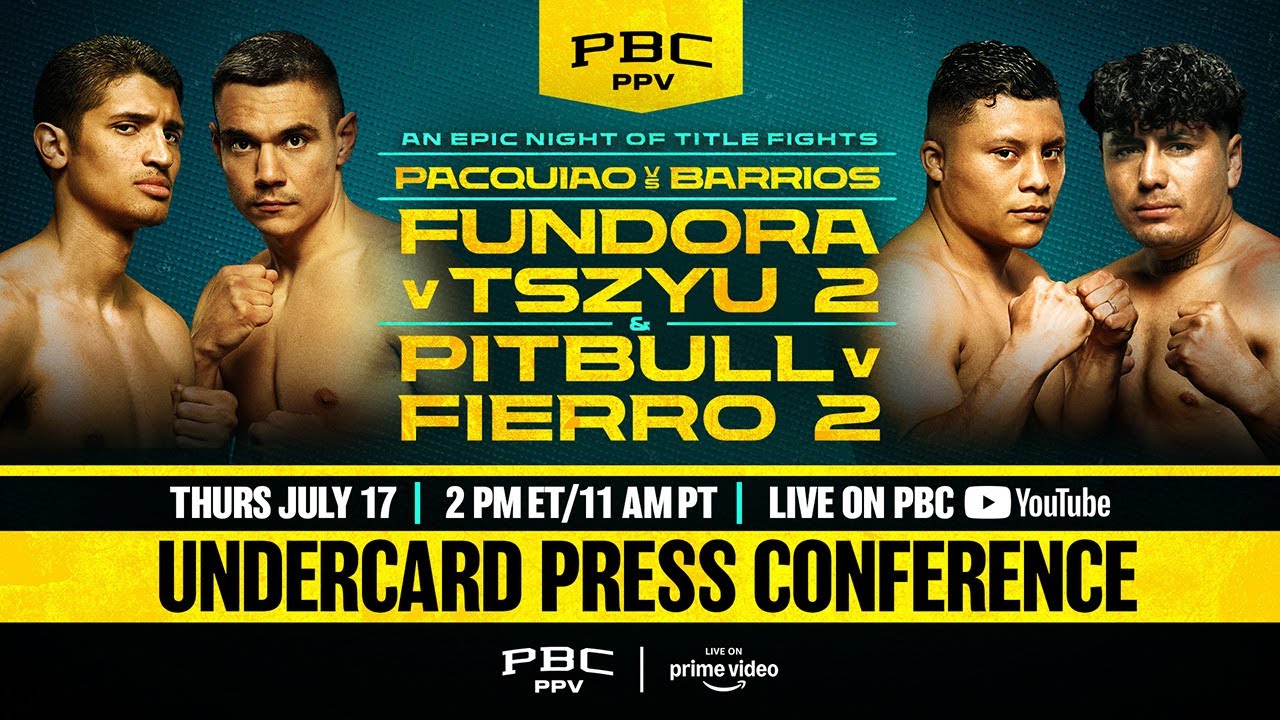 Watch live as fighters on the undercard of Pacquiao vs Barrios Fight Night, including Sebastian Fundora, Tim Tszyu, Isaac Cruz, Angel Fierro, Brandon Figueroa, Joet Gonzalez, Gary Russell Jr., Hugo Castañeda, David Picasso, Kyonosuke Kameda, Mark Magsayo and Jorge Mata Cuellar, hold their final press conference ahead of their respective matchups on Saturday, July 19, 2025, live on PBC PPV on Prime Video at 8pmET/5pmPT.